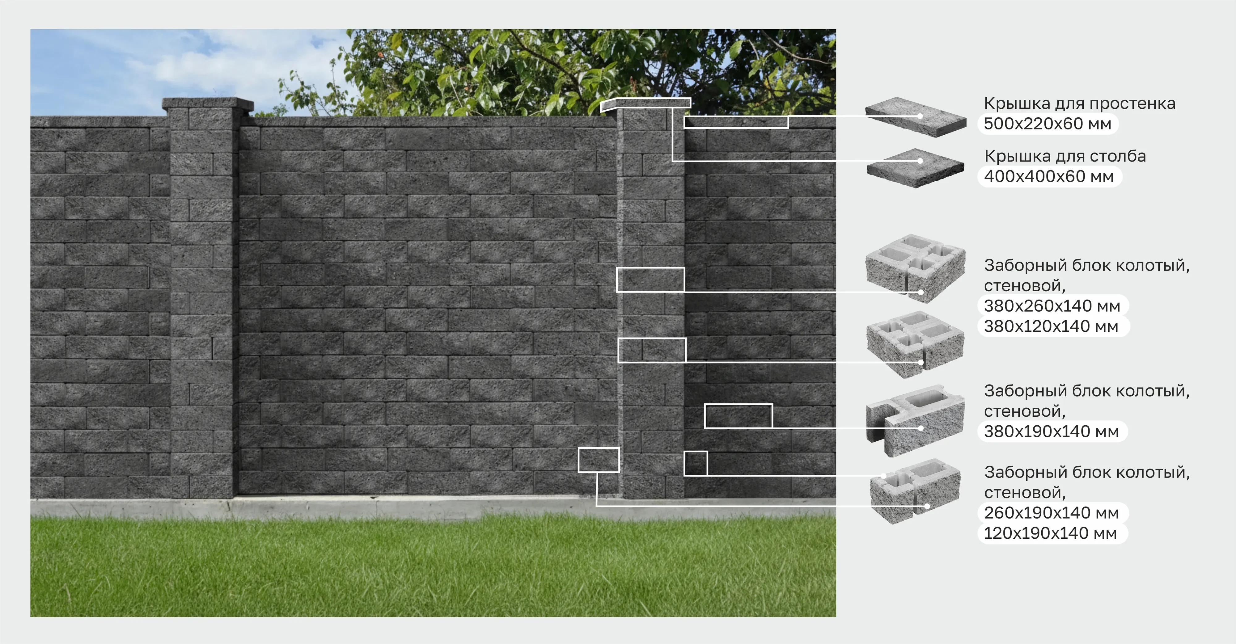 Заборный блок колотый, финишный, 260*190*140мм; 120*190*140мм, серый