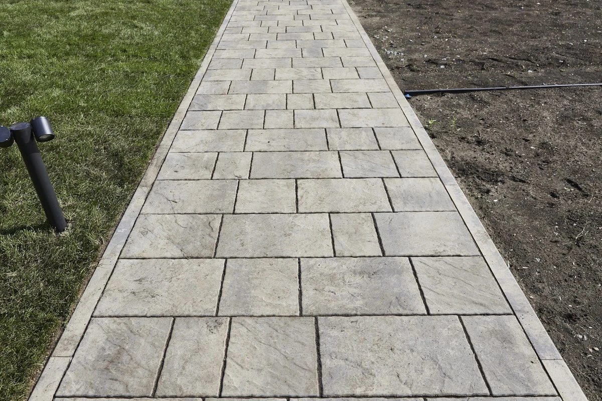 Четкие линии самой плитки дополняют геометричность укладки, делая территории еще более аккуратной. По краям от дорожек местами высажены цветы и поставлены ландшафтные украшения, которые также украшают общий дизайн в едином минималистичном стиле.