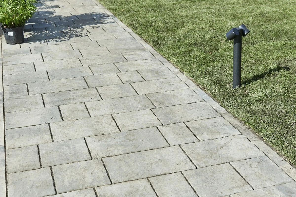 Для этих работ идеально подошли тротуарная плитка Литос в цвете Шунгит, а также бордюры в этом же цвете. Дорожки выполнены в строгом геометрическом формате с прямыми углами, ширина выбрана таким образом, чтобы как минимум два человека могли с легкостью идти рядом или разойтись на дорожке.