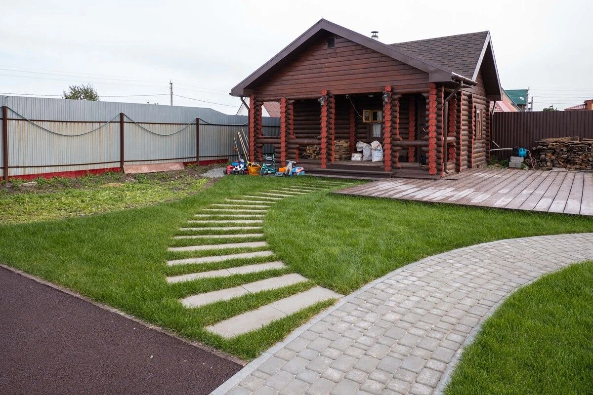 Для пошаговых дорожек выбрана плитка Ла-линия (прямоугольник) 600х300х80 мм по 2 штуки в ряд. Стандарт, цвет белый.