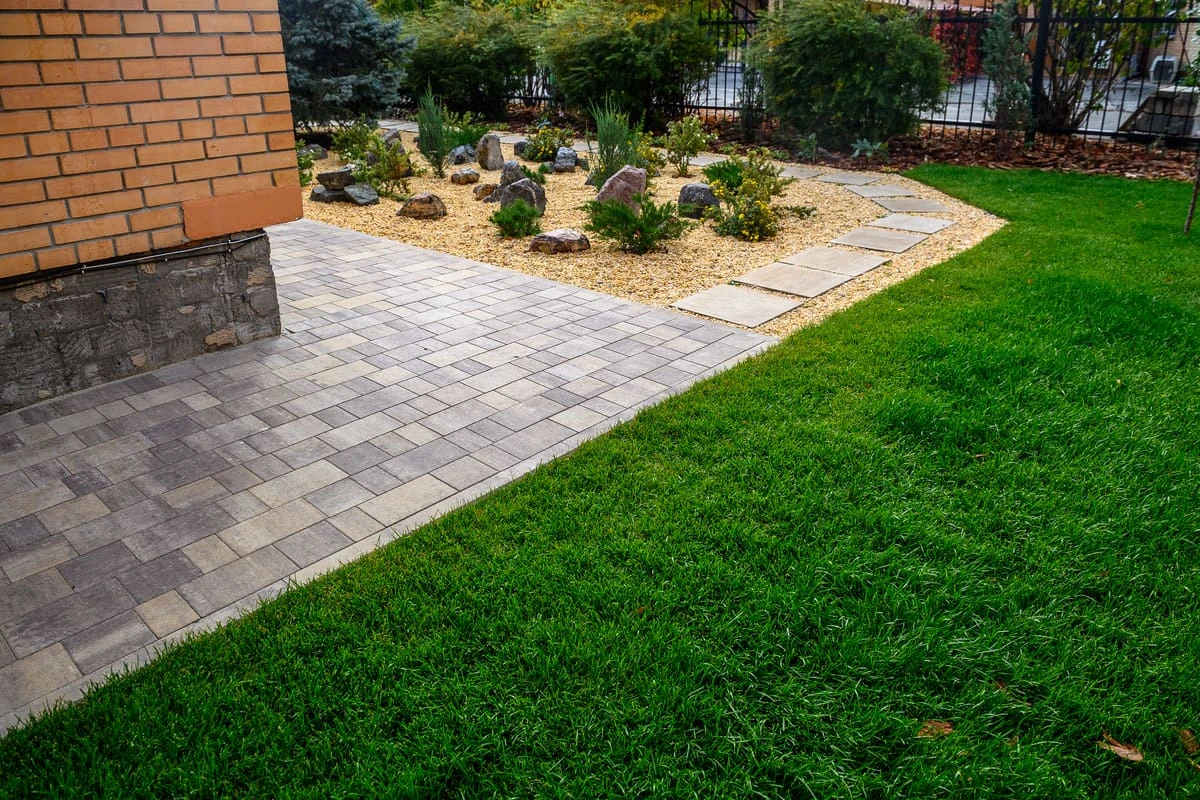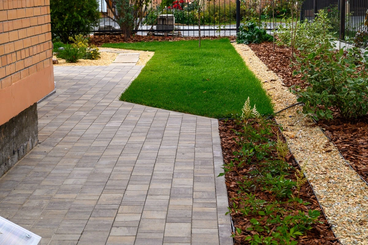 Для благоустройства территории частного дома была выбрана тротуарная плитка 40 мм толщиной. Это позволило сократить бюджет.