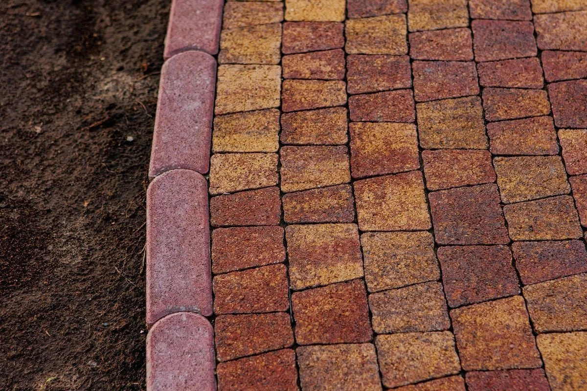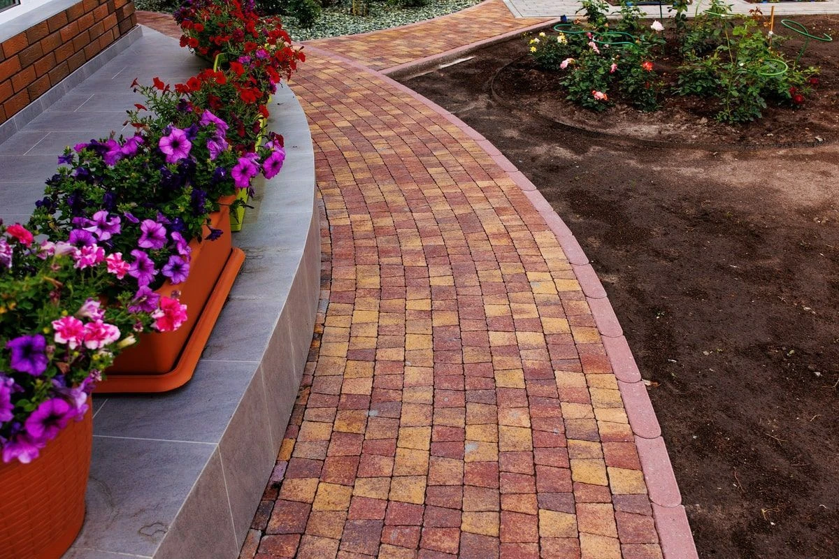 Необычная раскладка тротуарной плиты: комбинация узоров, фактур и цветов.