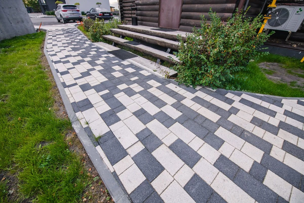Основной рисунок выстроен с помощью хаотичной разбивки черного и белого цвета, но в местах ближе к дороге или дому плитка переходит в один цвет — черный или белый. Это визуально отделяет прогулочную зону от всех остальных, при этом подобранные цвета гармонируют с постройкой.